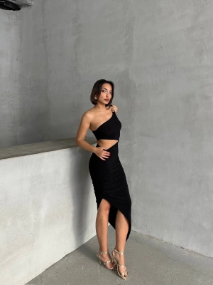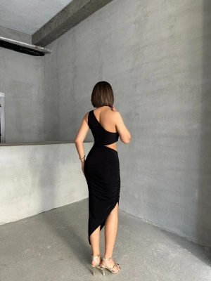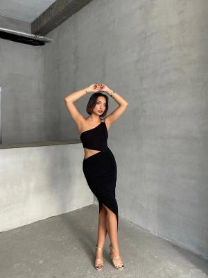 Bel Dekolteli Tek Omuz Elbise-siyah