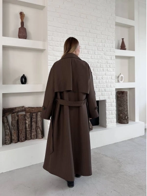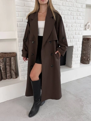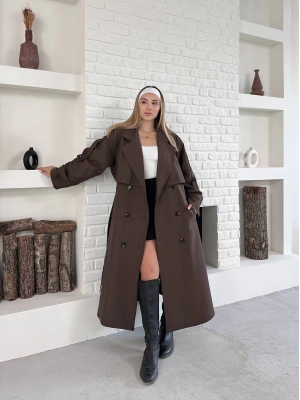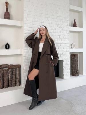 Astarlı Premium Çizgili Uzun Kaban-kahve