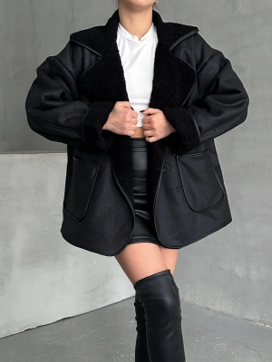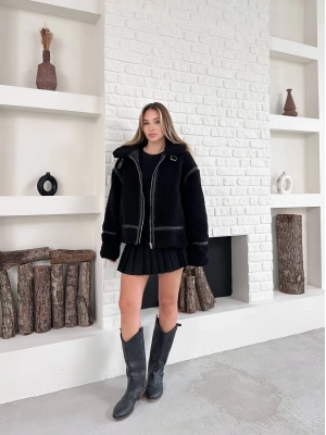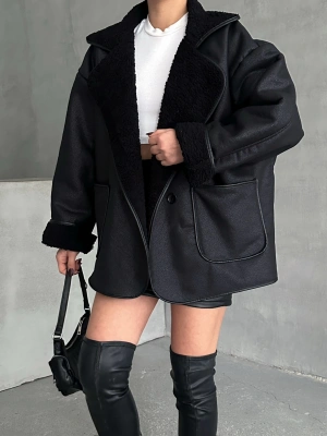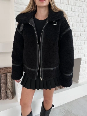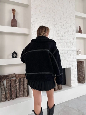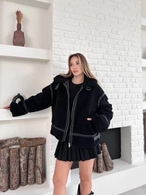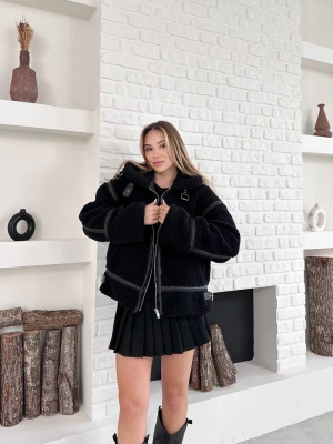 Biyeli Peluş Mont-siyah